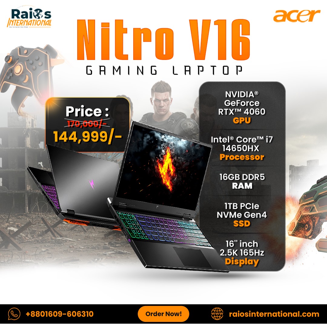 Discover the power-packed Acer Nitro 16 RTX4060 Gaming Laptop, available now at RaiOs International. Featuring an Intel Core i7-14650HX processor, 16GB DDR5 RAM, and a fast 1TB PCIe Gen4 SSD, this laptop ensures smooth multitasking and faster load times. Equipped with the latest NVIDIA GeForce RTX 4060 8GB GDDR7 GPU and a stunning 16″ 2.5K 165Hz IPS display, it’s perfect for immersive gaming. Explore unbeatable performance and check the latest Acer Nitro 16 RTX4060 Gaming Laptop Price at RaiOs International.